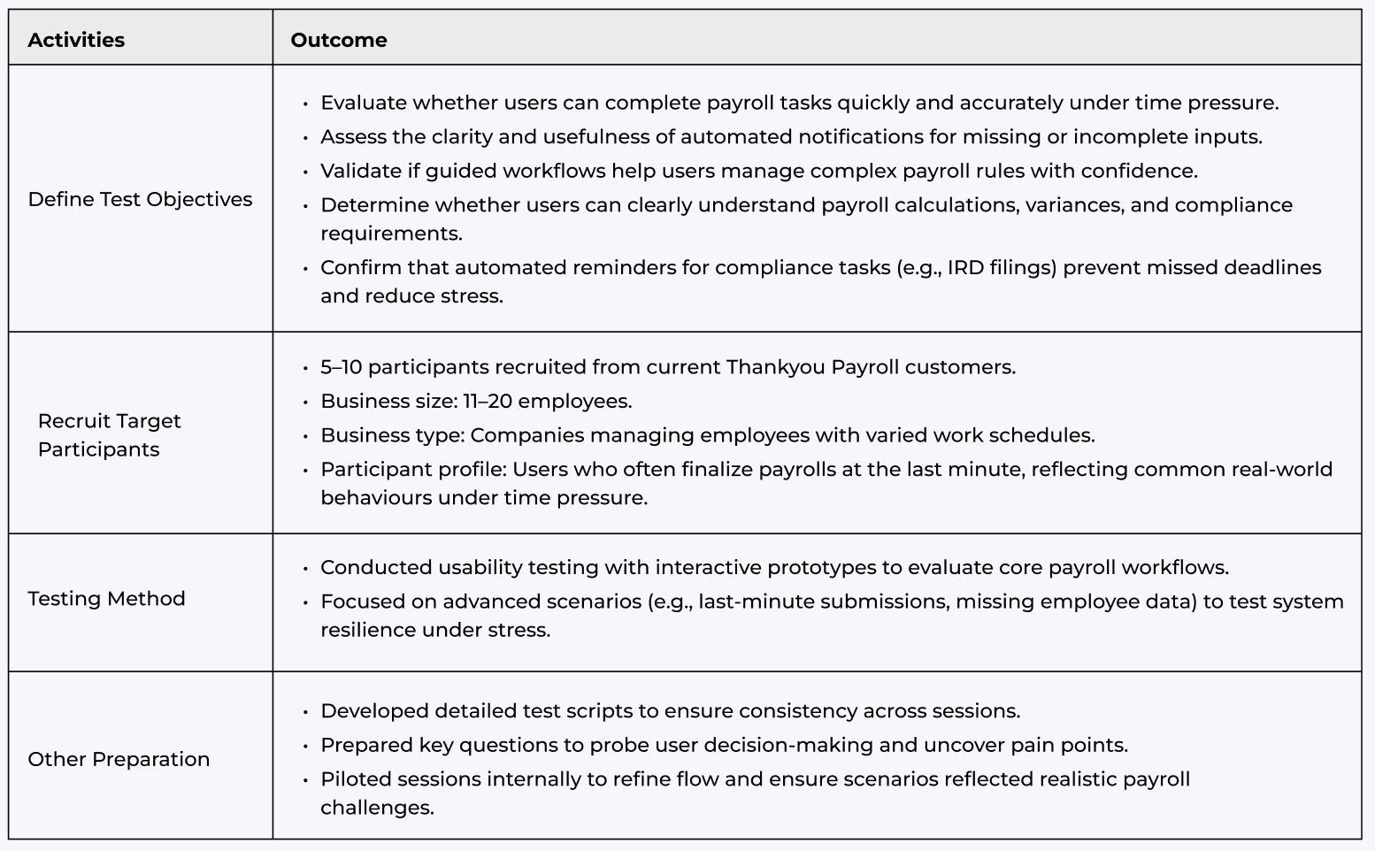 While preparing the prototype for testing, we designed a structured usability plan. This included defining clear objectives, recruiting representative participants, selecting testing methods, and preparing scripts to ensure consistency across sessions. Our aim was to validate whether the system supported real-world payroll scenarios under time pressure, provided clarity, and reduced errors.