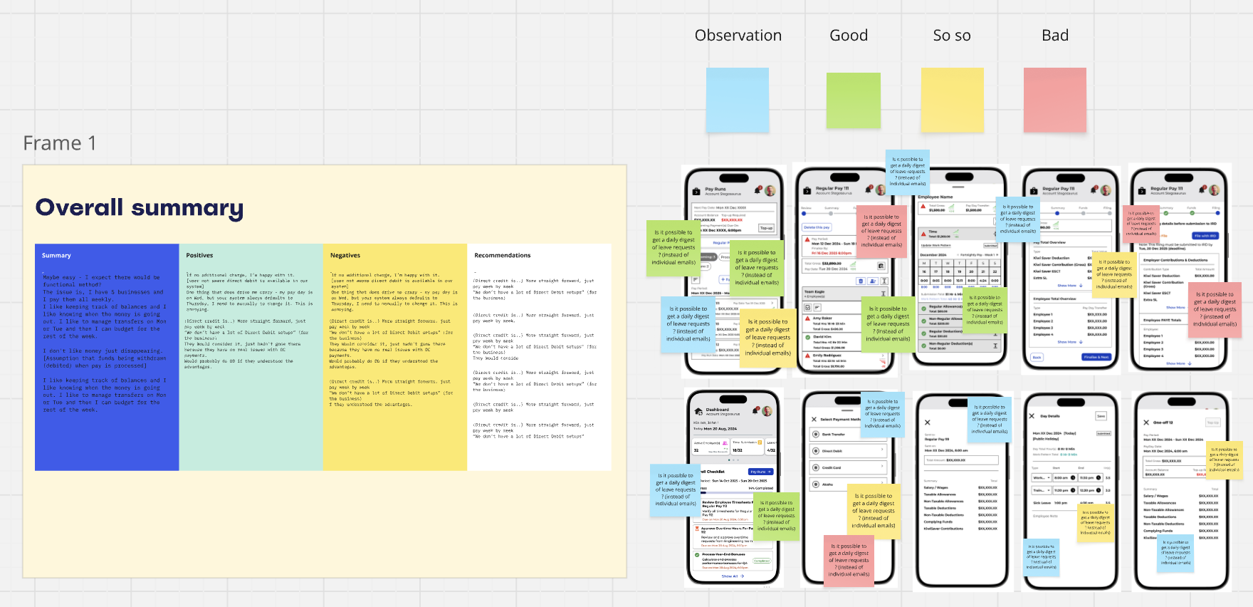 Before kicking off the design sprint, we deepened our understanding through multiple research methods: guerrilla testing, validating the current system, quantitative analysis, and competitive benchmarking. This comprehensive research provided a solid foundation for grasping the complexities of pay runs and transactions. Equipped with these insights, we proceeded with multiple rounds of 10-day design sprints to focus on specific areas, rapidly validate solutions, and foster close collaboration within the team. Here is the general design process: